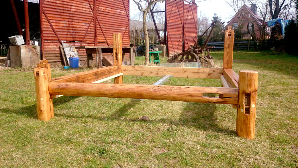 Dieses Balkenbett aus Altholz ist - wie alle meine Objekte - ein echtes Einzelstück. Das Holz stammt aus dem schönen Schleswig-Holstein und stand jahrelang in einer Scheune. Gebürstet,